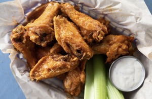 Crispy bone-in wings, tossed in your choice of sauce. Ranch or Bleu cheese. Celery on request. Sauces: Hot, Medium, Mild, Sweet Thai Chili, BBQ, Lemon Pepper, Pesto, or Naked.