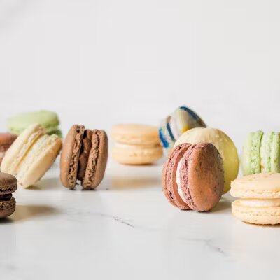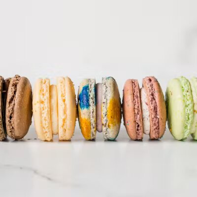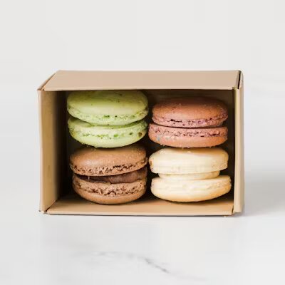 Our Standard Flavors include: - Chocolate - Pistachio - Vanilla Then there are 3 seasonal flavors. All macarons contain almonds.